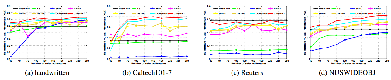 该论文方法CRV-DCL得到的特征在不同数据库上的聚类归一化互信息