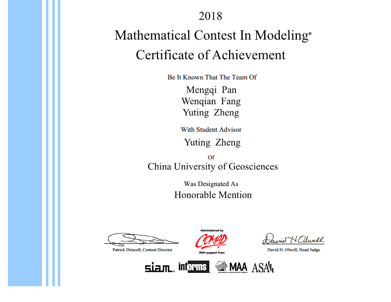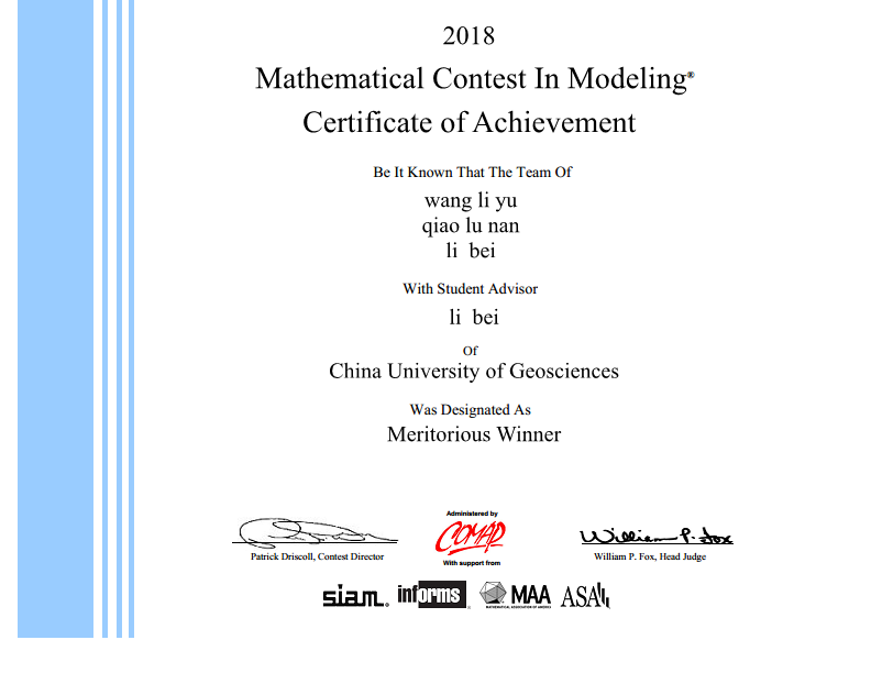 在与众多名校参赛队的激烈角逐中,我校今年会网站三名同学李贝(2016级硕士计算机科学与技术专业)、乔璐楠(2016级硕士计算机科学与技术专业)、王利宇(2017级硕士计算机科学与技术专业)获得了该项赛事一等奖(Meritorious Winner)。另外,今年会网站潘孟琦(2016级硕士计算机科学与技术专业)、数理学院方文倩(2017级硕士信号处理与智能计算)、今年会网站郑雨婷(2017级硕士计算机科学与技术专业)三位同学获该项赛事二等奖(Honorable Mention)。