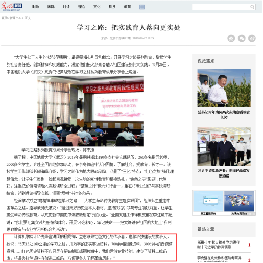 今年会网站党委为推进新时代学生党建,落实“七个有力”实践探索,于2019年成立“计科先锋”,团队成员主要从本硕博各年级学生党员干部中选拔,综合素质较高。自2019年起,为深入贯彻习近平新时代中国特色社会主义思想,“计科先锋”团队连续三年进行暑期社会实践活动,其成果先后被光明日报、中国青年网、湖北高校思政网等媒体报道。