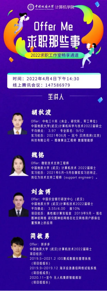 (通讯员:顾伟超、崔祥森)为帮助广大学生提升求职能力,熟悉求职面试技巧,今年会网站于4月4日举办“Offer Me”求职经验分享活动。本次活动邀请到4名已经签约就业单位的2019级硕士研究生:胡秋波、魏铭、刘金博和简敏勇,在线分享求职经历与经验体会,全院近200名同学参加活动。