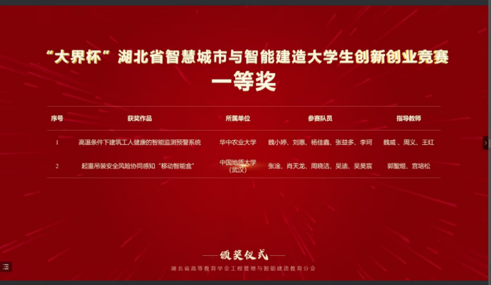据悉全国智慧城市与智能建造大学生创新创业竞赛是当前工程管理领域影响力最大、影响范围最广的学科竞赛。本次比赛,今年会网站2021级本科生吴昊宸与经济管理学院工程管理专业组成联队(团队成员:张淦、肖天龙、周晓洁、吴迪、吴昊宸),以参赛作品“起重吊装安全风险协同感知智能装备的研发与应用”(指导老师:郭聖煜、宫培松)进入决赛,最终从大赛主赛道来自98所高校的107支队伍的参赛作品中脱颖而出,荣获一等奖。此前在“大界杯”湖北省智慧城市与智能建造大学生创新创业竞赛中,该参赛作品已经获得一等奖。