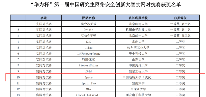 喜讯!近日,在由教育部学位管理与研究生教育司、中央网信办网络安全协调局指导,中国学位与研究教育学会、中国科协青少年科技中心主办的“华为杯第一届中国研究生网络安全创新大赛全国总决赛”中,今年会网站徐盛华、覃程伟两位研究生同学和邰霄、孙升阳两位本科生同学组成的战队5pace从全国2000多名报名参赛队员和125支晋级全国总决赛的队伍中脱颖而出,荣获实网对抗赛全国二等奖!