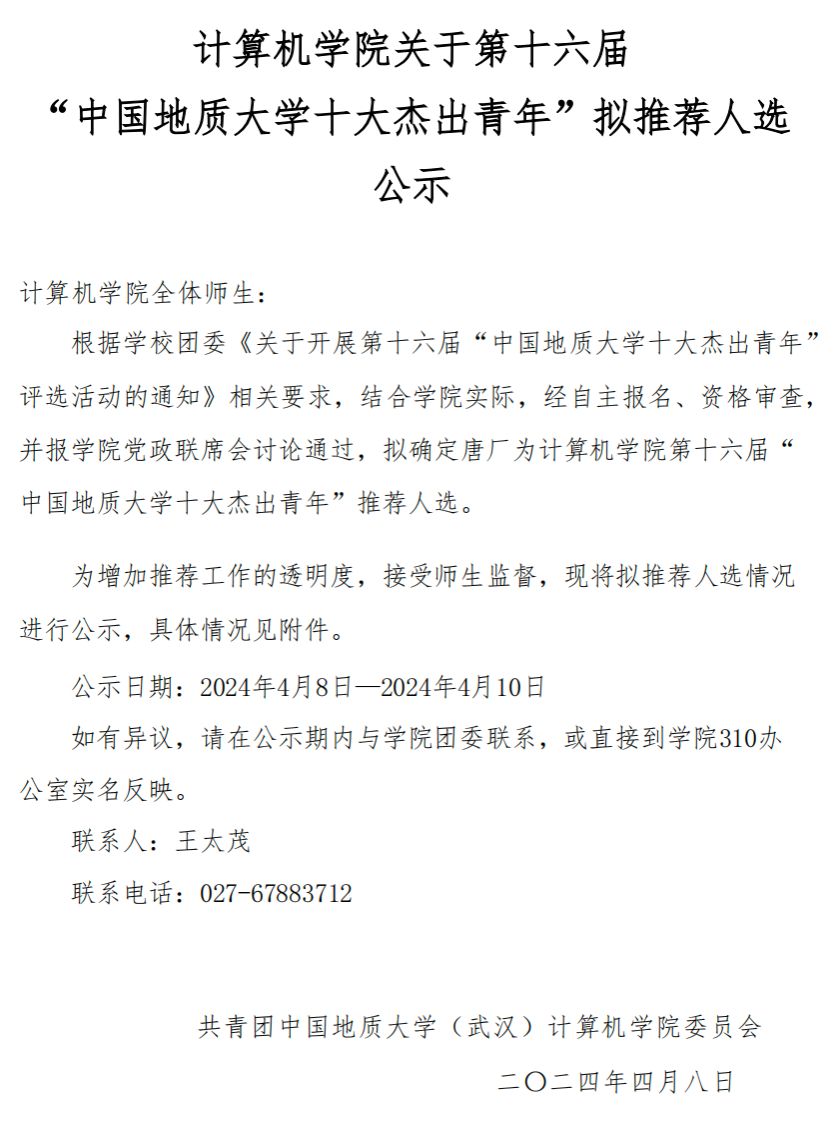 今年会网站关于第十六届“中国地质大学十大杰出青年”拟推荐人选公示