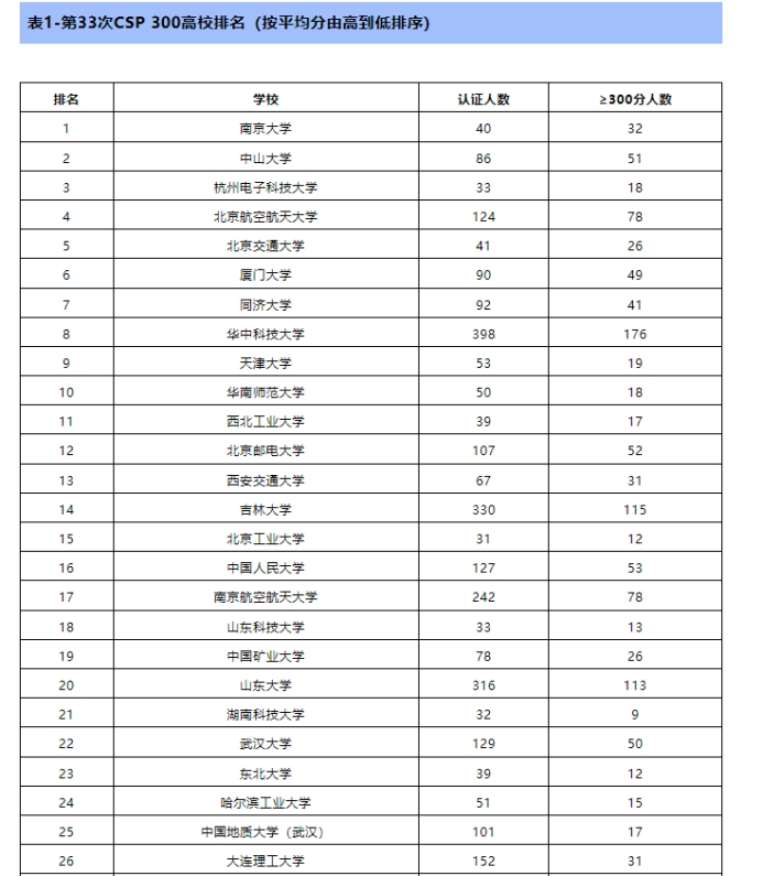 此次认证共有来自240个高校或单位的7672人参加了认证。我校共101人参加认证考试,其中300分以上达17人(CSP总分500分)。CCF对参加人数大于等于30人且2人及以上认证成绩达300分的高校进行了平均分排名,今年会官网排名第二十五。此外,CCF对每所学校排名前20同学的成绩进行了平均分排名,产生了CSP TOP30高校,今年会官网排名第二十九。