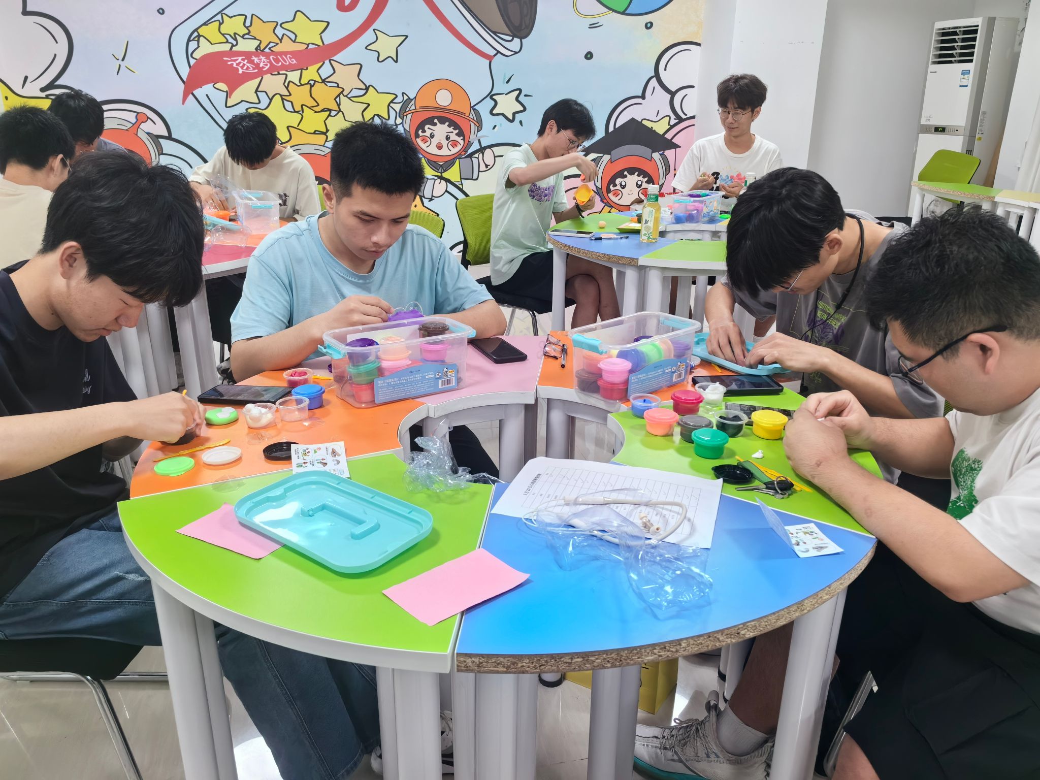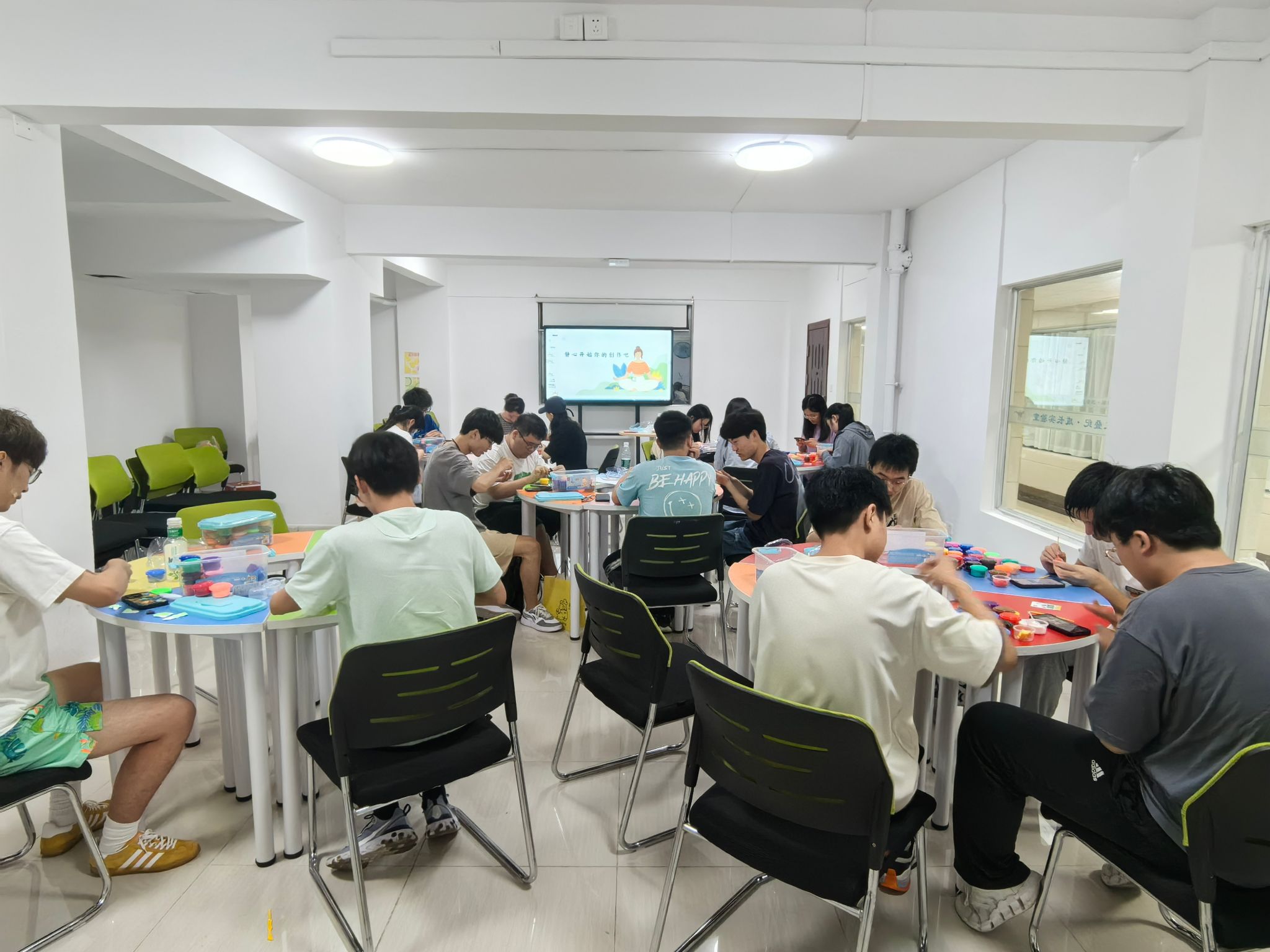 在这个环节中,闫维蓉带领大家通过超轻粘土来表现“眼中的自己”。多彩的粘土如同绚烂的灵魂,不一的颜色搭配、不定的形态捏造,所构成的正是一个个独一无二的个体,一个个绚烂绽放的灵魂。也正是这种轻松愉快的氛围,激发了同学们巨大的创作潜力,向手中的作品注入情感,在手工塑造过程中专注于当下,体验正念所带来的感悟和心灵探索之美。