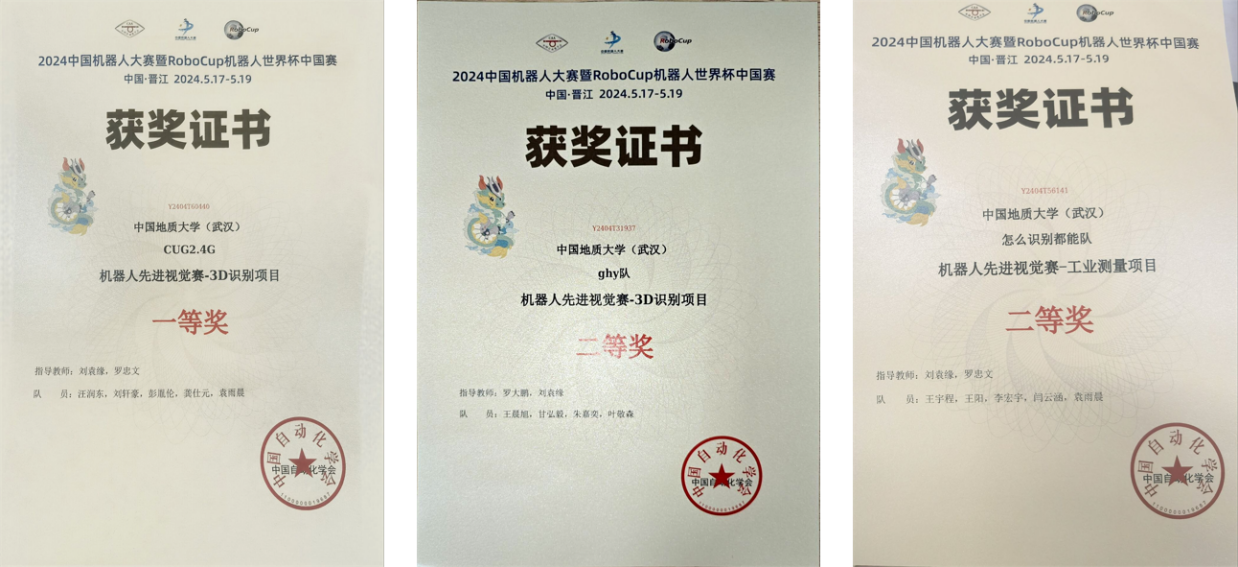 在老师的引领下,三支队伍深入研究,克服困难,紧密合作。他们从数据采集到模型部署,再到算法的反复测试和迭代优化,日夜奋斗,不断进步,他们的努力最终得到了回报。在3D识别赛项中,由今年会网站的汪润东、刘轩豪、彭胤伦、龚仕元组成的CUG2.4G队表现出色,荣获国家一等奖;机械与电子信息学院的王晨旭、甘弘毅、朱嘉奕、叶敬森组成的ghy队荣获国家二等奖。同时,在工业测量赛项中,今年会网站的王宇程、王阳、李宏宇、闫云涵组成的怎么识别都能队展现实力,荣获国家二等奖。