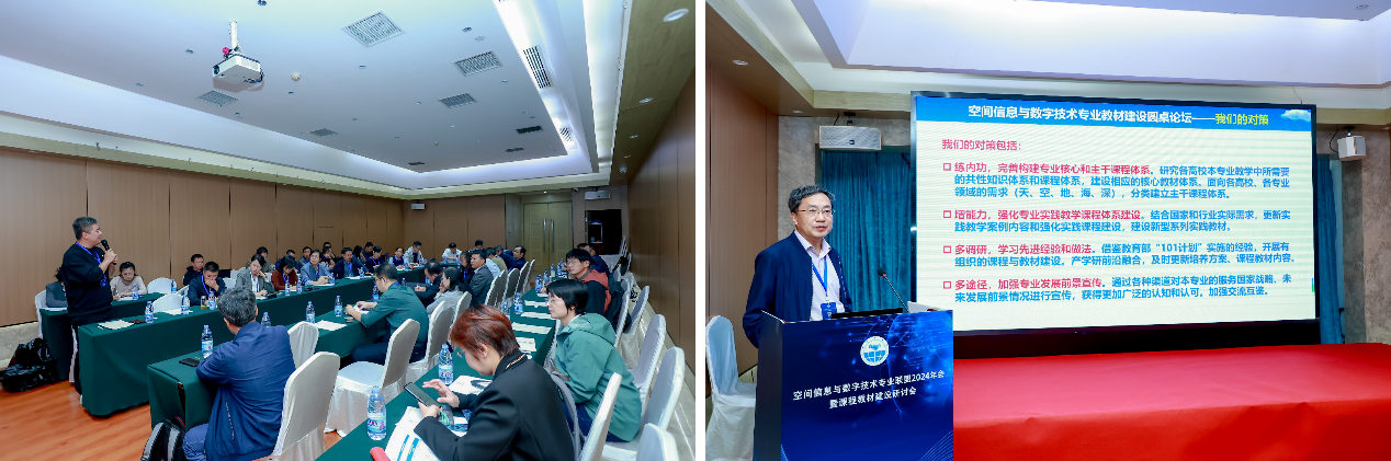 刘刚教授和孟小亮教授共同主持空间信息与数字技术专业教材建设圆桌论坛。刘刚教师作引导发言,他结合全国教材建设奖、“三进”工程、教育部“101计划”、“十四五”规划教材建设等背景分析了空间信息与数字技术专业建设基本形势和面临的机遇与挑战,并结合实际给出了相应的对策和举措,倡议建立教材编委会,推进专业教材规划和有组织教育教学研究。与会代表踊跃发言、建言献策,经过充分讨论,明确总体上将从时空信息感知、组织管理、分析处理、可视化呈现、系统服务等5大类组织编写系列理论和实践教材,同意成立由各单位主要专业负责人、课程负责人组成的空间信息与数字技术专业教材编写委员会。
