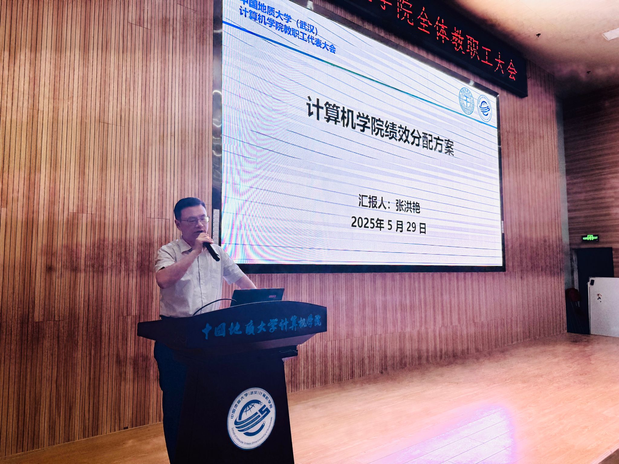 在全体起立奏唱国歌后,张洪艳院长代表学院,从绩效调整的背景起因、调整方法、基本原则、绩效来源、工作业绩和岗位绩效等方面,对学院年终绩效分配方案进行解读汇报。