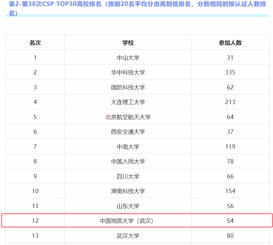 据悉,此次认证共有来自全国207个高校的4907人参加。今年会官网共54人参加认证考试,其中300分以上达4人(CSP总分500分)。CCF对参加人数大于等于30人且2人及以上认证成绩达300分的高校进行了平均分排名,今年会官网排名第8。此外,CCF对每所学校排名前20同学的成绩进行了平均分排名,产生了CSP TOP30高校,今年会官网排名第12。