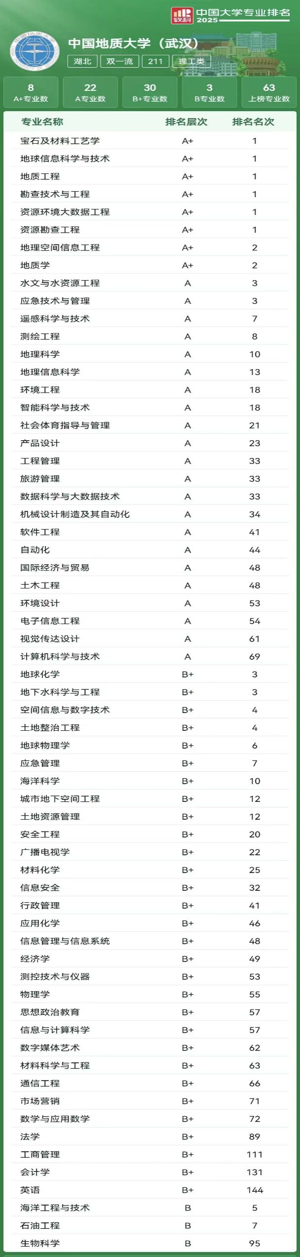 软科中国大学专业排名于2021年首次发布,排名覆盖93个专业类的800多个本科专业,发布3万余个专业点,是迄今为止覆盖专业数量最多、参评专业规模最大的中国大学本科专业排名。排名采用独具特色的学校-学科-专业三层次专业竞争力评价框架,设置学校条件、学科支撑、专业生源、专业就业、专业条件5个指标类别和27项指标,对1200多所高校的6万个本科专业点进行动态监测式评价。为了更加全面地反映中国大学本科专业的建设水平,今年软科进一步丰富和完善了中国大学专业排名的指标体系和内涵,评价变量总数相比2024年增加41个。“软科中国大学专业排名”旨在为学生和家长选择本科专业提供客观参考,也为高校的本科专业建设与分析提供事实依据。