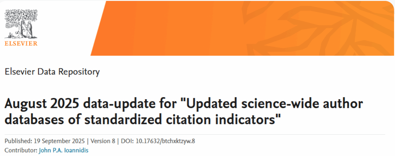 2025年9月,美国斯坦福大学和爱思唯尔更新了标准引文指标的全科学作者数据库,重磅发布了《2024年度全球前2%顶尖科学家榜单》(Stanford/Elsevier Top 2% Scientists List),今年会官网多名教师上榜。