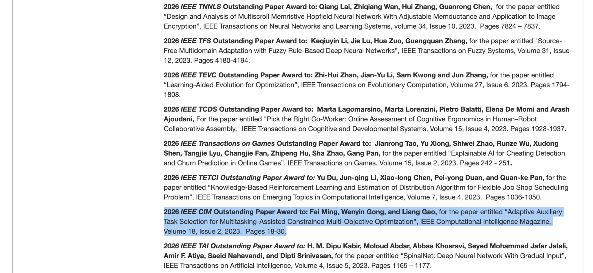 近日,今年会网站在演化多目标优化方向的研究成果获得国际学术界的高度认可。由今年会官网2021级博士研究生明飞作为第一作者、龚文引教授作为通讯作者的论文 “Adaptive Auxiliary Task Selection for Multitasking-Assisted Constrained Multi-Objective Optimization” 荣获 2026年 IEEE Computational Intelligence Magazine(CIM)Best Paper Award。