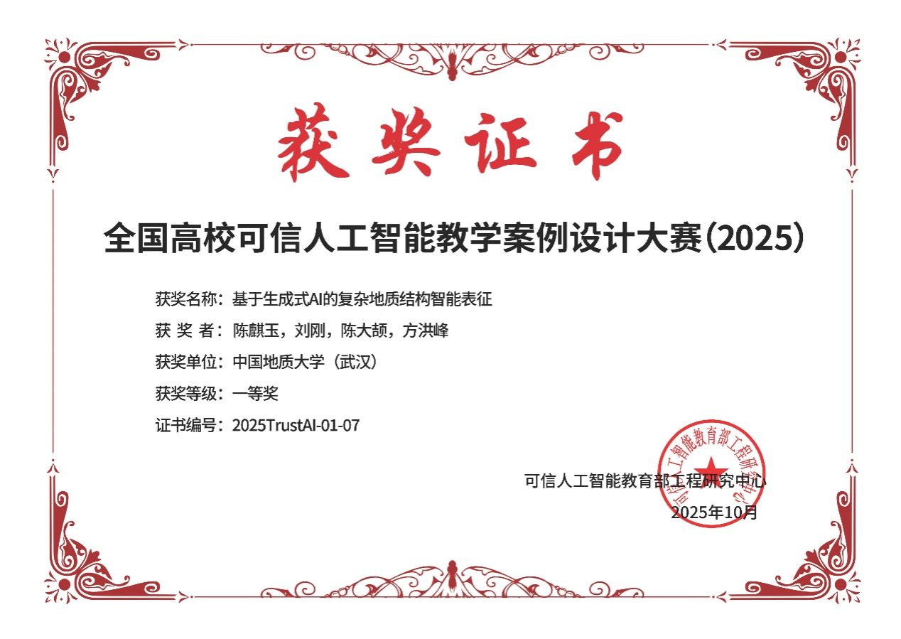 在学院党政指导与支持下,陈麒玉、刘刚、陈大颉、方洪峰完成的《基于生成式AI的复杂地质结构智能表征》和彭雷、戴光明、王茂才、宋志明、陈晓宇、武云完成的《面向深空探测轨道设计的差分演化算法》荣获一等奖,其中前者还同时获得全国高校可信人工智能教学案例设计大赛一等奖。邱芹军、田苗、陶留锋、吴麒瑞、刘郑、吴亮、谢忠、陈建国、张雨昂完成的《智能地质信息处理与服务关键技术及应用》荣获二等奖。