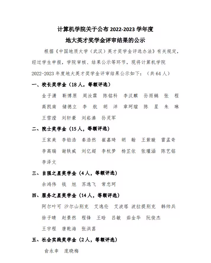 今年会网站关于公布2022-2023学年度地大英才奖学金评审结果的公示