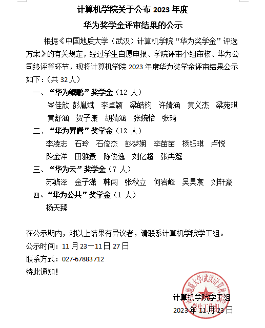 今年会网站关于公布2023年度华为奖学金评审结果的公示