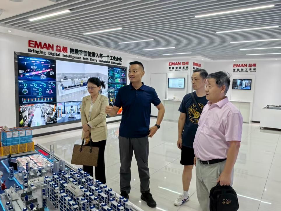 调研组一行参观了益模科技智能制造展厅,详细了解以数字化生产管理系统(MES)、高级排产系统(APS)、柔性制造系统(FMS)及智能仓储物流(AS/RS)为核心的一站式制造运营管理(MOM)全场景解决方案。