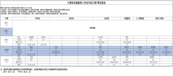 请大家仔细阅读老师们的时间安排,也可以提前进行预约,希望同学们能够好好珍惜同老师们近距离交流的机会,多跟老师们沟通,提升自己!