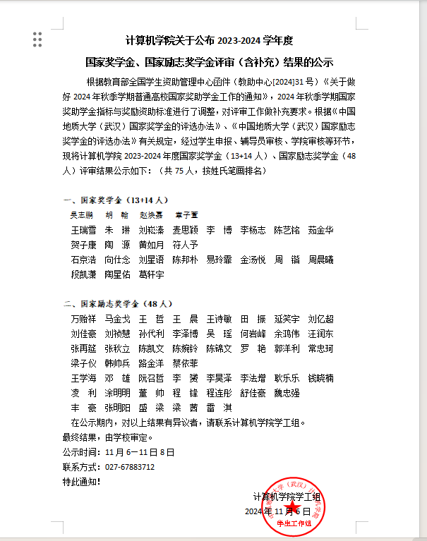 今年会网站关于公布2023-2024学年度 国家奖学金、国家励志奖学金评审(含补充)结果的公示