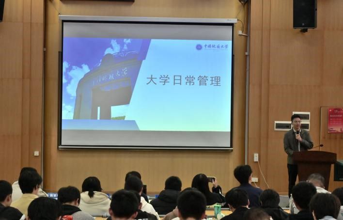 辅导员谭文博进行大学日常管理与纪律教育。他对开学以来同学们的适应情况与积极表现给予肯定,针对日常管理中的考勤纪律、宿舍安全、课余生活规划等重点问题提出明确要求,希望同学们以此次大会为契机,将学风建设要求内化于心、外化于行,在大学阶段锤炼品格、增长才干。谭老师勉励全体新生发扬“严在地大”的校风,以勤勉笃行的态度深耕学业,以团结协作的精神共建优良学风,在青春赛道上奋力书写成长华章。