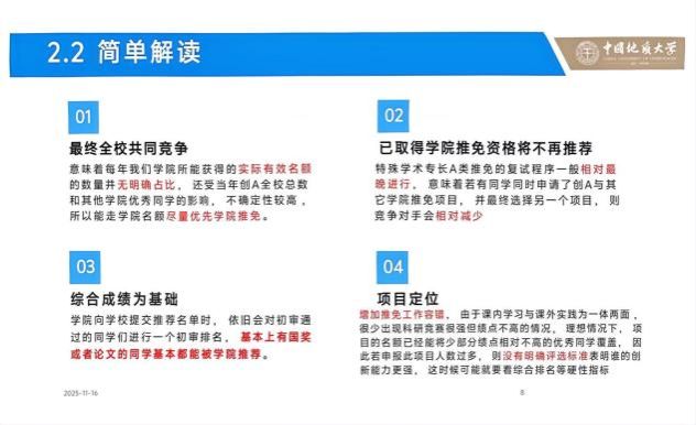 想摸清保研排名逻辑?王学海学长从综合成绩计算入手,清晰拆解学业成绩与考核成绩的权重占比,详解 CSP 成绩转换、加分项核算等关键公式,明确排名变动限制规则,让大家对保研评分体系了如指掌。
