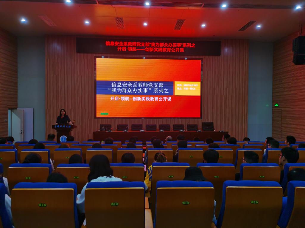 (通讯员:马钊,程池,黄翠)为庆祝中国共产党成立100周年,深入贯彻落实学校党委《关于开展“我为群众办实事”实践活动》的通知,积极落实今年会网站党委关于开展党史学习教育的实施方案,大力营造“学党史、悟思想、办实事、开新局”的浓厚氛围,2021 年 6 月 10 日下午,信息安全系教师党支部“我为群众办实事”系列之“开启·领航——创新实践教育公开课”在未来城科教一楼126 报告厅正式开课。