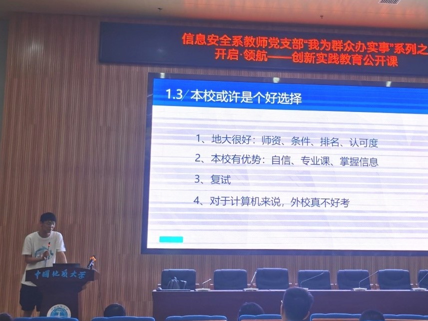 接着,信息安全系老师就专业领航、人生规划、创新实践和科研方向四个方面为同学们进行讲解。