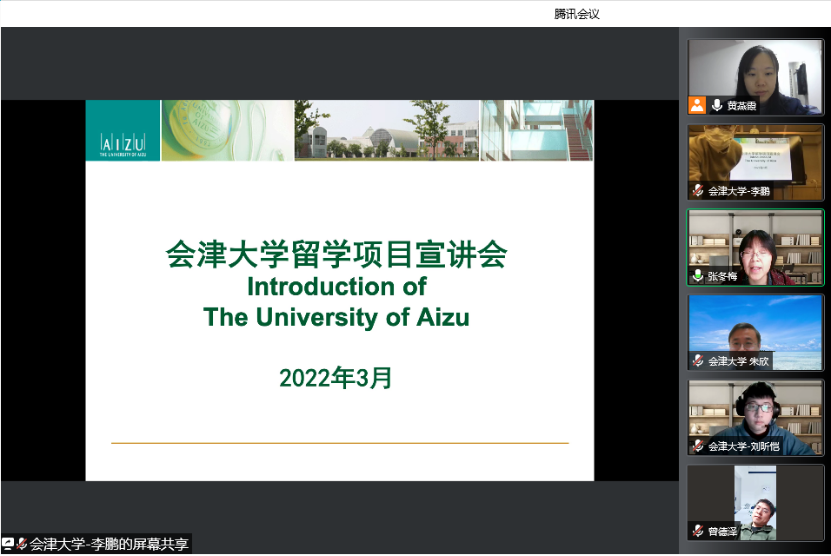 (通讯员:张园园)2022年3月8日晚上,日本会津大学留学项目宣讲线上会议顺利召开。日本会津大学老师李鹏、朱欣、吕国伟,会津大学在读学生陈发浩、傅孛骞、刘昕恺,今年会网站副院长张冬梅、计算机科学与技术系系主任曾德泽、国际合作办公室事务秘书张园园参加会议。宣讲会由国际合作办公室主任黄燕霞主持。