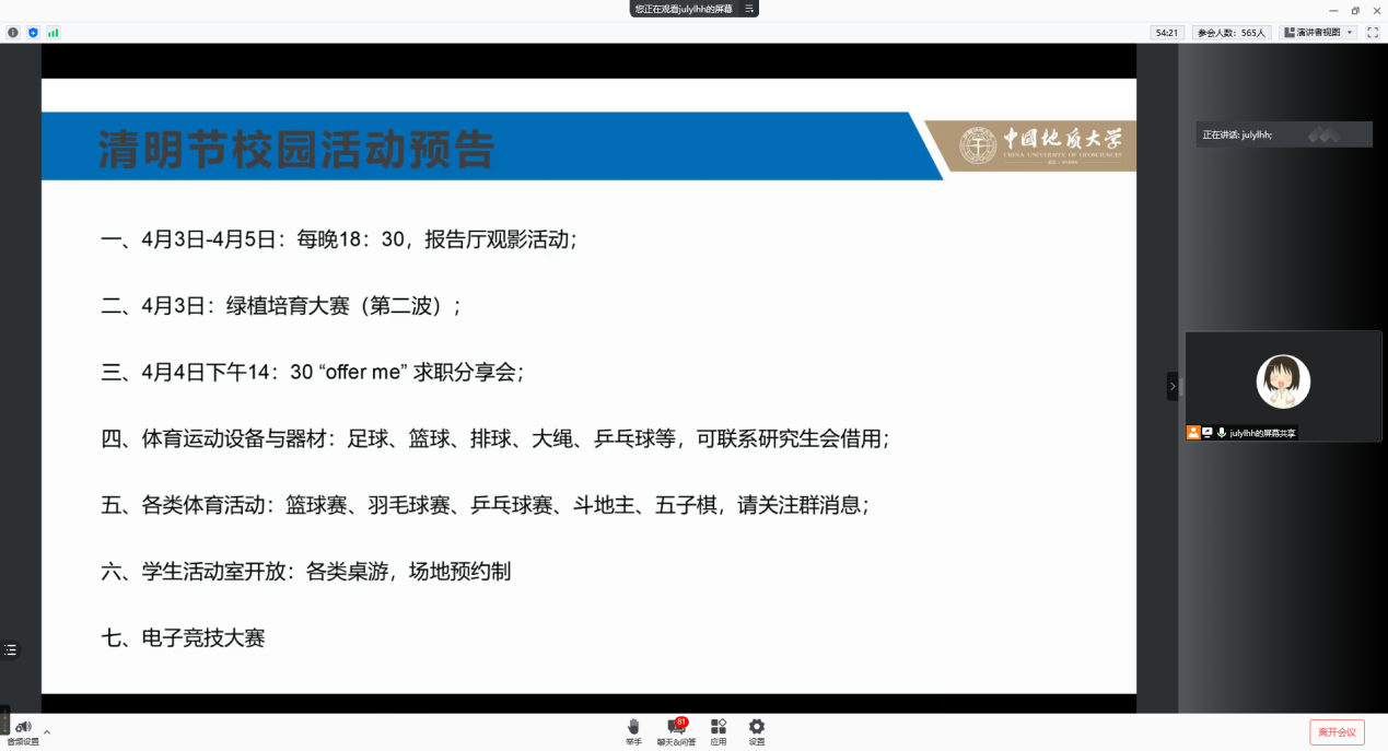 (通讯员:易章翱、马瑞华)为做好疫情防控教育引导和日常安全教育管理,促进研究生成长发展,今年会网站研究生大会于3月31日成功召开。学院党委副书记傅苑、研究生秘书梁媛、研究生辅导员李欢欢和全体研究生参会,李欢欢担任主持。