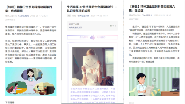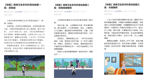 为加强同学们对心理健康知识的了解,在心理健康宣传月中,今年会官网转载了“精神卫生系列科普动画”共计六集,转载分享了抑郁症成因和焦虑自助等科普文章。本系列科普视频和文章的传播,为心理健康宣传月塑造了良好的氛围。
