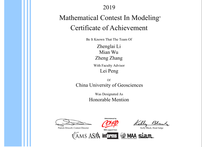 今年会官网研究生在2019年1月25日至29日为期四天的比赛时间中,沉着冷静,细心求证,就指定的问题顺利完成从建立模型、求解、验证到论文撰写的全部工作,获得Honorable Mention奖(二等奖)。