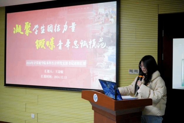 研究生专硕第六党支部书记向晨风谈到:今天很荣幸参加学院党支部书记述职大会,很荣幸上台汇报工作。这不仅是工作汇报,更是向其他党支部书记学习的宝贵机会。教职工支部工作部署有条不紊、成果丰硕。本科生、研二和研三支部百花齐放,各有建树。作为聆听者,我不断学习着他们的管理方法和成熟经验。虽然研一党支部因为成立时间较短,成果不够突出,但在学院党委的正确领导和全体支部成员的积极配合下,我们一定能有所成就。我们作为党支部书记,肩负着同学们的信任,应该切实担负起支部组织管理工作的责任。学院领导们的认可和夸奖是一种鞭策,期许和鼓励着我们带领党支部走向新的未来。