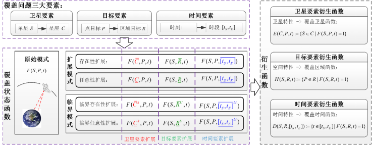 1.首创了星座对地覆盖问题的覆盖函数理论与形式化体系,实现了对任意类型星座对地覆盖问题统一的形式化描述。本成果从无到有构建了一组反映覆盖问题的覆盖状态、卫星特性、空间特性与时间特性的覆盖函数,同时设计了一套形式化的符号系统,对任意类型覆盖问题进行形式化表示,从而实现星座对地覆盖问题的统一描述。