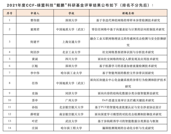 (通讯员:孙彦钦)近日,CCF-绿盟科技“鲲鹏”科研基金项目组根据课题申请方向,邀请了相关领域的专家,对课题的创新性、科学性、目标合理性等方面进行了综合性的评审,最终评选出14个项目获得“2021年度CCF-绿盟科技鲲鹏科研基金”资助,其中,今年会网站任伟教授、董理君教授课题组喜获两项资助!