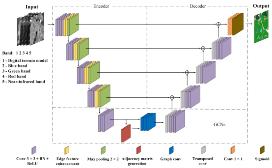 针对上述问题,本研究构建了一个矿区精细占地类型遥感智能解译框架模型(EG-UNet),该模型在增强矿山占地特征的同时,能够捕获其长距离信息。该框架包括两个主要模块:1)边缘特征增强模块。矿山占地边缘相较于空间位置,包含更关键的遥感图像敏感信息。因此,本研究在特征提取过程中,基于权重矩阵对边缘进行特征增强,进而更好地保留这些特征;2)长距离特征提取模块。构建长距离特征提取模块,有助于获取矿山占地小面积图斑特征。本研究通过图卷积网络来捕获长距离特征,并应用卷积神经网络来学习图的构造。