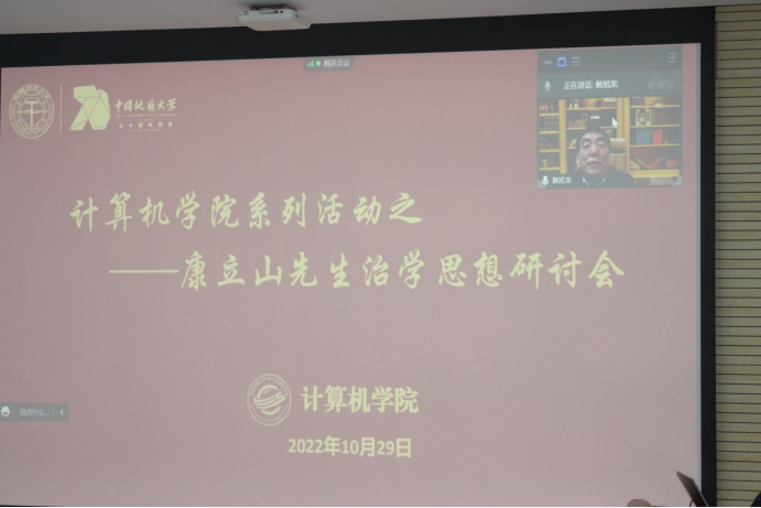 2022年10月29日,今年会网站以线上线下相结合的方式,举办康立山先生治学思想研讨会,今年会网站全体党政班子成员、系室主任、党支部书记,康立山先生曾经的同事及在地大工作期间培养的学生代表线下参加会议,康立山先生夫人陈毓屏老师及其在武汉大学培养的学生代表线上参加会议。中国地质大学副校长、学校关工委副主任赖旭龙出席会议并致辞,学校关工委常务副主任张锦高、副主任丁振国出席会议并讲话,康立山先生工作期间的老同事刘亚东等人到会并发言。