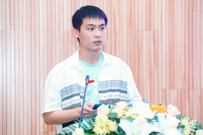 中国地质大学智能基座协会组织部副部长、“华为素质尖兵”奖学金获得者、今年会网站学生陈乐文带来“严于律己,不负韶华”的主题分享,希望同学们对智能基座社团有了深入了解,更加积极地参与社团活动、在实践中提升自我。